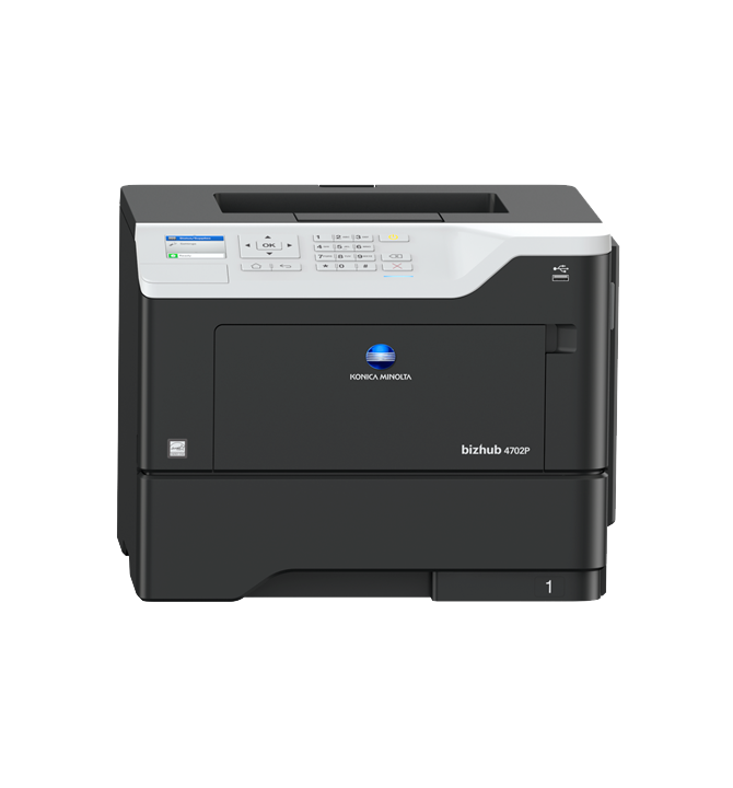 The Konica Minolta bizhub 4702P is a professional monochrome printer designed for offices and workgroups that require fast, dependable black-and-white performance without extra complexity. Built on a compact desktop footprint, it delivers up to 50 pages per minute and high-resolution prints up to 1200 x 1200 dpi for clear text and graphics.